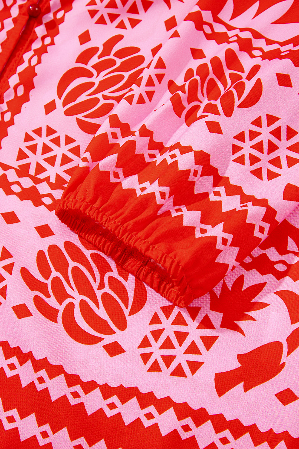 Strawberry Pink Abstract Floral Print Tie Neck Button Decor 3/4 Sleeve Blouse