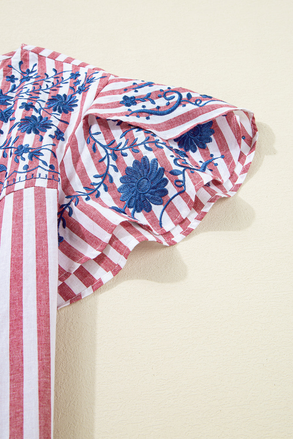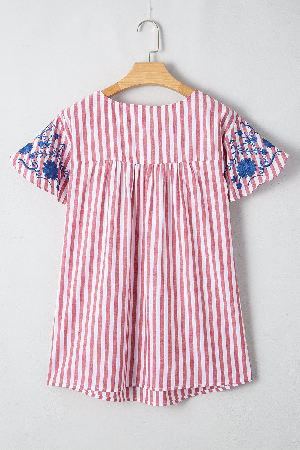 Red Stripe Plus Size Floral Embroidered Petal Sleeve Blouse