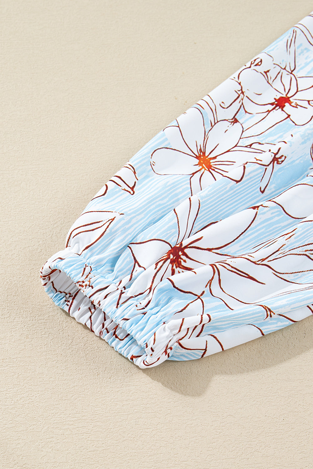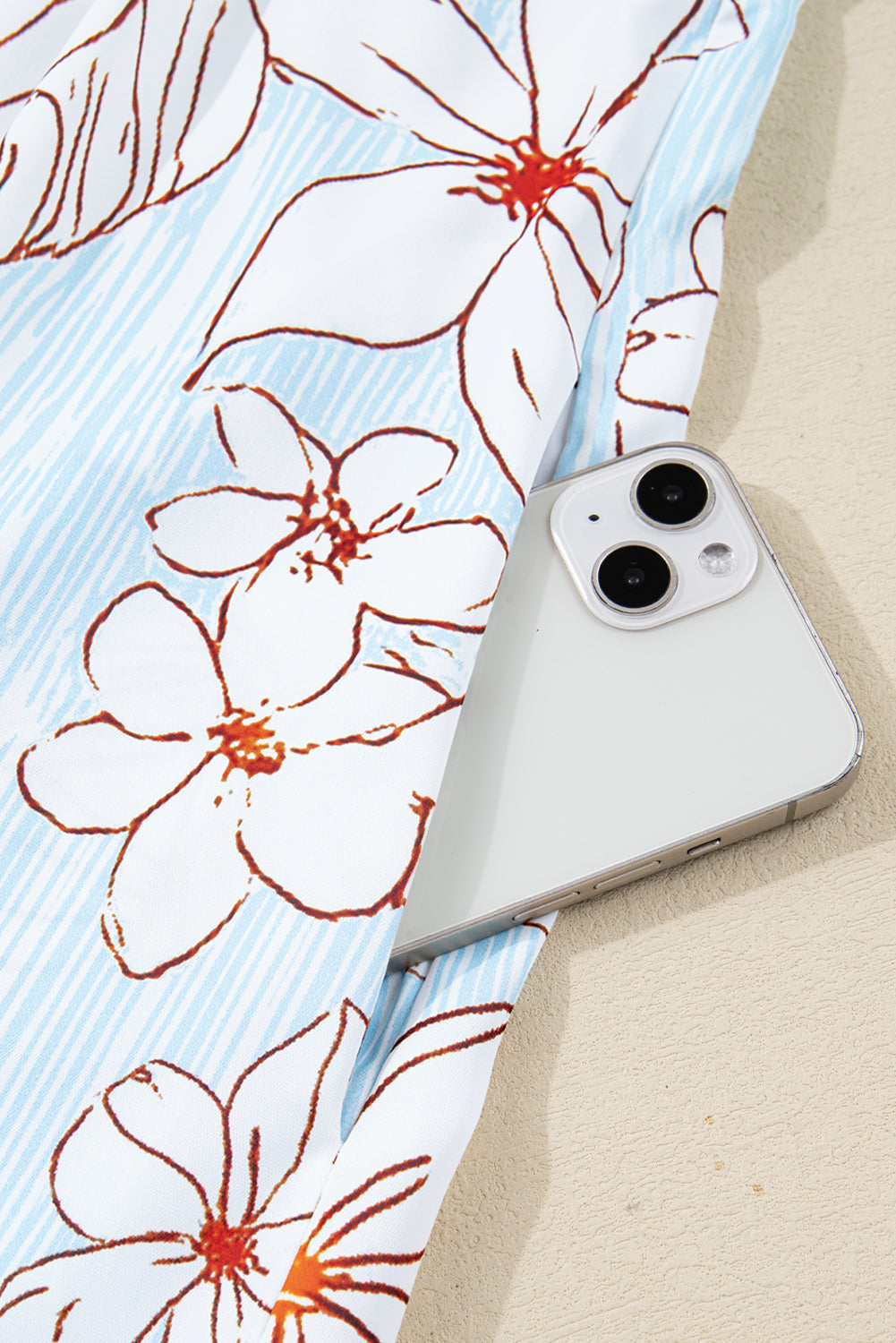 Brown Floral Print Tie Neck 3/4 Sleeve Mini Dress